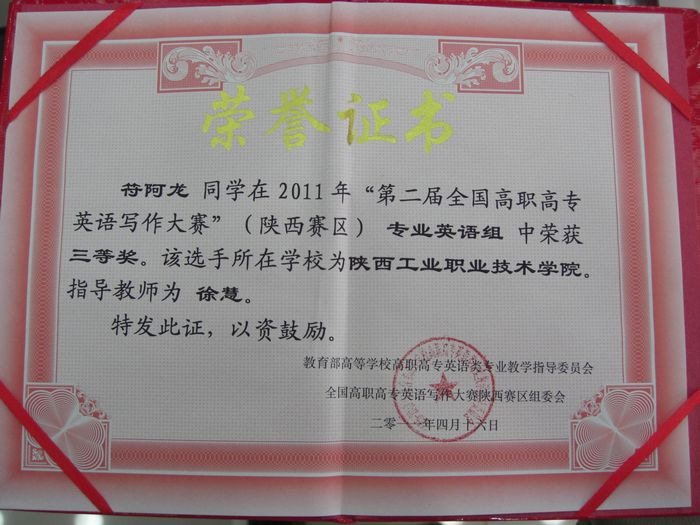 全国高职高专英语写作大赛是由国家教育部英语教指委主办的一项针对高职高专学生的英语赛事,分学校初赛、省级半决赛和全国总决赛三个阶段的比赛。2011年4月初,我院在校内进行了层层选拔,最后纺检0904班的李莹同学、服装设计1003班的赵丹丹同学和商务英语0902的符阿龙同学在众多选手中脱颖而出,代表我院参加省级比赛,与来自陕西23所学校的57名选手进行了角逐。大赛最后评出了专业英语组特等奖3名,一等奖1名,二等奖2名,三等奖3名,公共英语组特等奖5名,一等奖2名,二等奖6名,三等奖13名。我院纺检0904班李莹同学获公共英语组特等奖,商务英语0902班符阿龙同学获专业英语组三等奖。