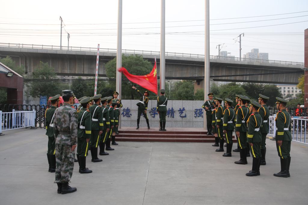 6时50分,升旗仪式正式开始,迎着晨曦,国旗护卫队队员护送国旗走向升旗台,伴随着《义勇军进行曲》的奏响,鲜艳的五星红旗在学院南门冉冉升起,全体师生昂首肃立,行注目礼。