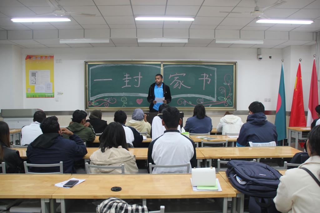 11月4日,工商管理学院留学生举行了“一封家书”主题班会活动。一封封家书,一份份真情,留学生们把平时没有机会对父母表达的爱写在信里;把对父母的感恩沁在动容的泪水中;更把对新生活的展望寄于声声承诺中。留学生们的家书辞藻并不华丽,行文也很短小,甚至掺杂着英语、汉字、拼音等多种表达方式,但每一封家书都表达出真挚的思亲之情,也传递出他们在中国努力学习的决心和展望。