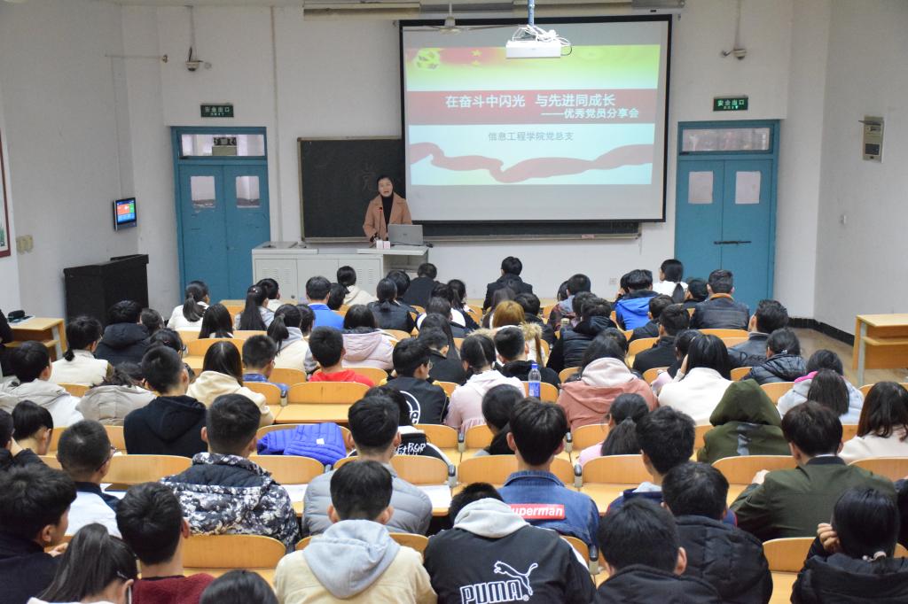 为推进“两学一做”学习教育常态化、制度化,深入实施“两学一做”特色活动,强化一名党员一面旗帜的示范作用,以榜样的力量教育和引导青年学生胸怀理想,勤奋学习,11月29日下午,信息工程学院党总支邀请优秀共产党员李俊老师在崇文西楼103开展“在奋斗中闪光,与先进同成长”优秀党员分享会,信息学院学生党员、入党积极分子以及学生会干部200余人到场聆听。