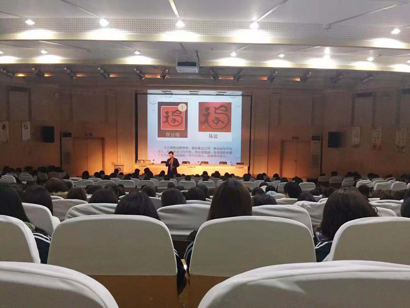 报告中,党秀孟从自己大学期间的学习、工作、生活到毕业后的就业、择业经历入手,告诫学弟学妹们要找准定位,学会规划,学好知识,积累经验,培养爱好,快速成长,培养情商,开阔眼界,多听经验,学会坚持。并将中国汉字的起源、发展及写好中国字的重要性与如何写好中国字的方法做了详细讲解,党秀孟的精彩演讲博得了现场师生们的热烈掌声。他以身示范了如何将兴趣、爱好、坚持、努力与工作完美结合,激励工商学子们不断奋进,实现自我,回报社会。