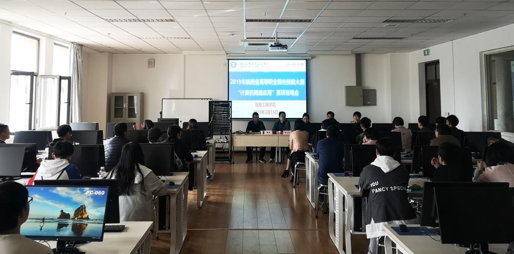 3月15日,2019年陕西省高等职业院校技能大赛“计算机网络应用”赛项说明会在我院精艺楼五楼召开,福建中锐网络股份有限公司高级工程师王欢、姜勇,信息工程学院院长何玉辉、训练中心主任吕阿璐,以及来自全省18所院校的参赛师生参加了会议。会议由信息工程学院副院长殷锋社主持。