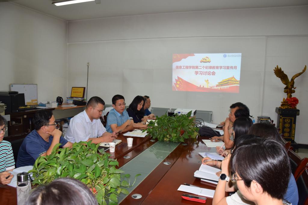 信息工程学院党总支在学院第二个纪律教育学习宣传月活动安排以来,按照活动要求,紧扣活动主题,认真进行落实,以保证活动效果,使每一位党员在今后的工作中能明纪律、知敬畏、存戒惧、守底线、做表率,为学院“双高”建设贡献力量。