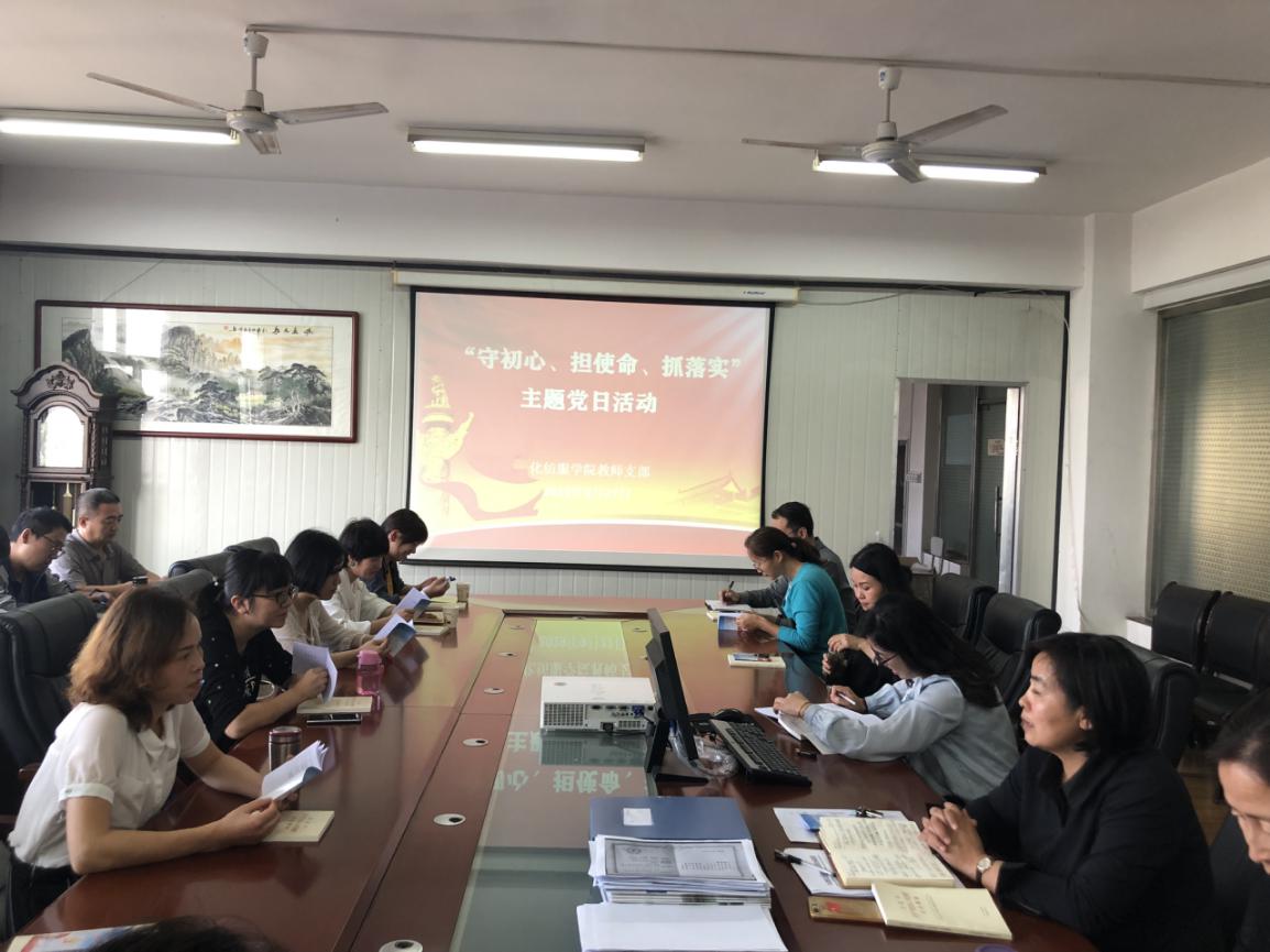 为深入学习贯彻新时代中国特色社会主义思想、锤炼忠诚干净担当的政治品格,化工与纺织服装学院于9月27日召开“守初心、担使命、抓落实”主题党日活动,会议在化工与纺织服装学院教学办召开,由贾格维院长主持,全院教师党员参会。