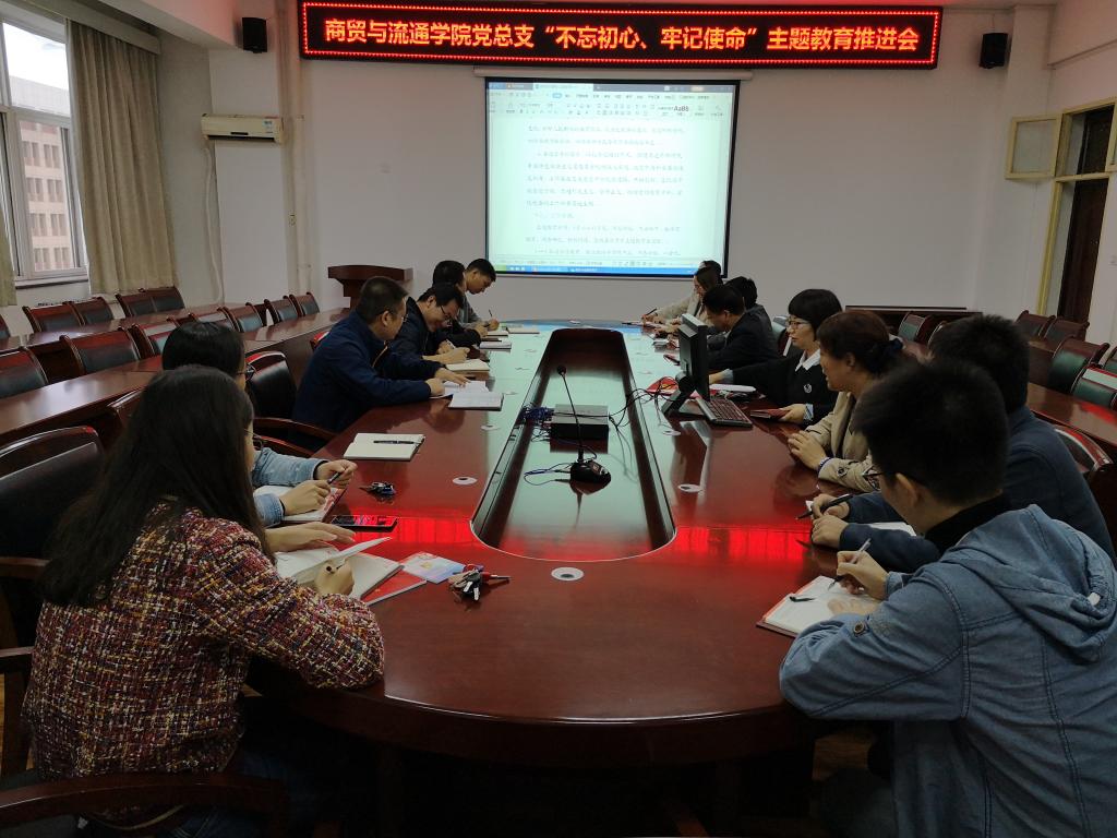 为深入推进“不忘初心、牢记使命”主题教育,提升新当选党总支委员、支部委员的党务工作能力。10月8日下午,商贸与流通学院党总支在崇文楼五楼召开“不忘初心、牢记使命”主题教育推进会暨新一届委员培训会。商贸与流通学院党总支委员、支部委员、党小组组长参加会议。
