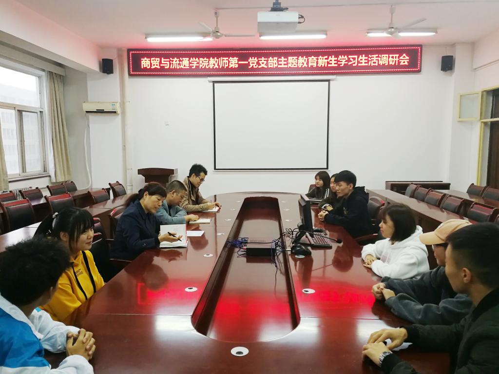 根据支部主题教育计划安排,10月23日下午,商贸学院教师第一支部在5楼会议室召开主题教育新生学习生活调研会,旨在发现、解决新生学习生活等方面的问题。党总支书记陈昊平、支部书记晋淑惠和支委成员参加了会议,会议由晋淑惠书记主持。