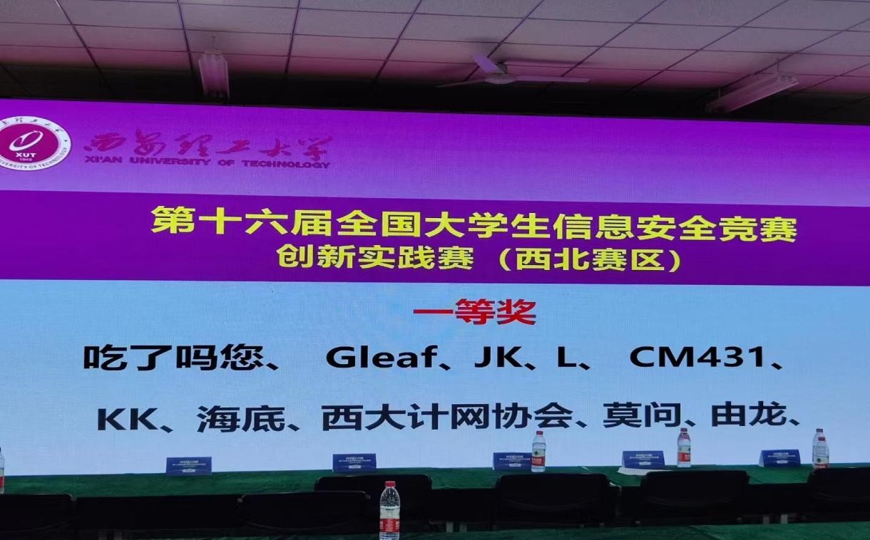 6月23日,2023年第十六届全国大学生信息安全竞赛创新实践能力赛西北赛区分区赛在西安理工大学举行,来自西安电子科技大学、西安邮电大学、西北工业大学、西安理工大学等30所高校,53支战队一较高下,由我院信息工程学院杨鹏老师指导-安全与测试工作室的成员:网络2003班豆凯歌、网络2102班刘德辉、网络5191班魏子恒、网络2102班董丹丹组成的海底战队,经过5月27日-5月28日线上初赛和和6月23日线下区域决赛,激烈角逐,斩获分区赛一等奖,成功晋级决赛。