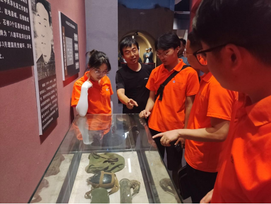 图上为纪念馆讲解员向实践团队员讲述陈列物品在当时革命战争中的作用