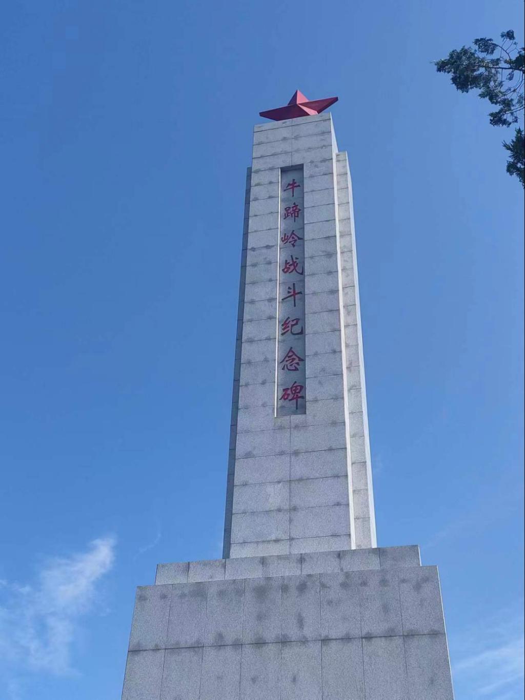 实践团成员站在牛蹄岭战斗纪念碑下,仰望纪念碑,拾级而上,“牛蹄岭战斗纪念碑”高耸入云,纪念碑上赫然刻着八个大字“牛蹄岭战斗纪念碑”。左右两面分别摆放着印有牛蹄岭战役简介的书形石雕,通过对书形石雕的阅读,成员们充分认识到了牛蹄岭战役的残酷和艰难,纪念碑背面刻着牺牲战士们的名字,他们用自己鲜活的生命换来了我们今天的和平和幸福生活。实践团成员在庄严的战斗纪念碑前,肃穆站立,向革命烈士鞠躬致敬,献花,表达了缅怀之情。