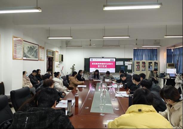 会上,电气学院副院长董佳辉领学了《关于开展2023年新进教师签订“师德师风承诺书”活动的通知》和《新时代高校教师职业行为十项准则》文件精神,要求全体老师务必在思想上高度重视,严明师德师风行为底线,严防师德失范行为发生。