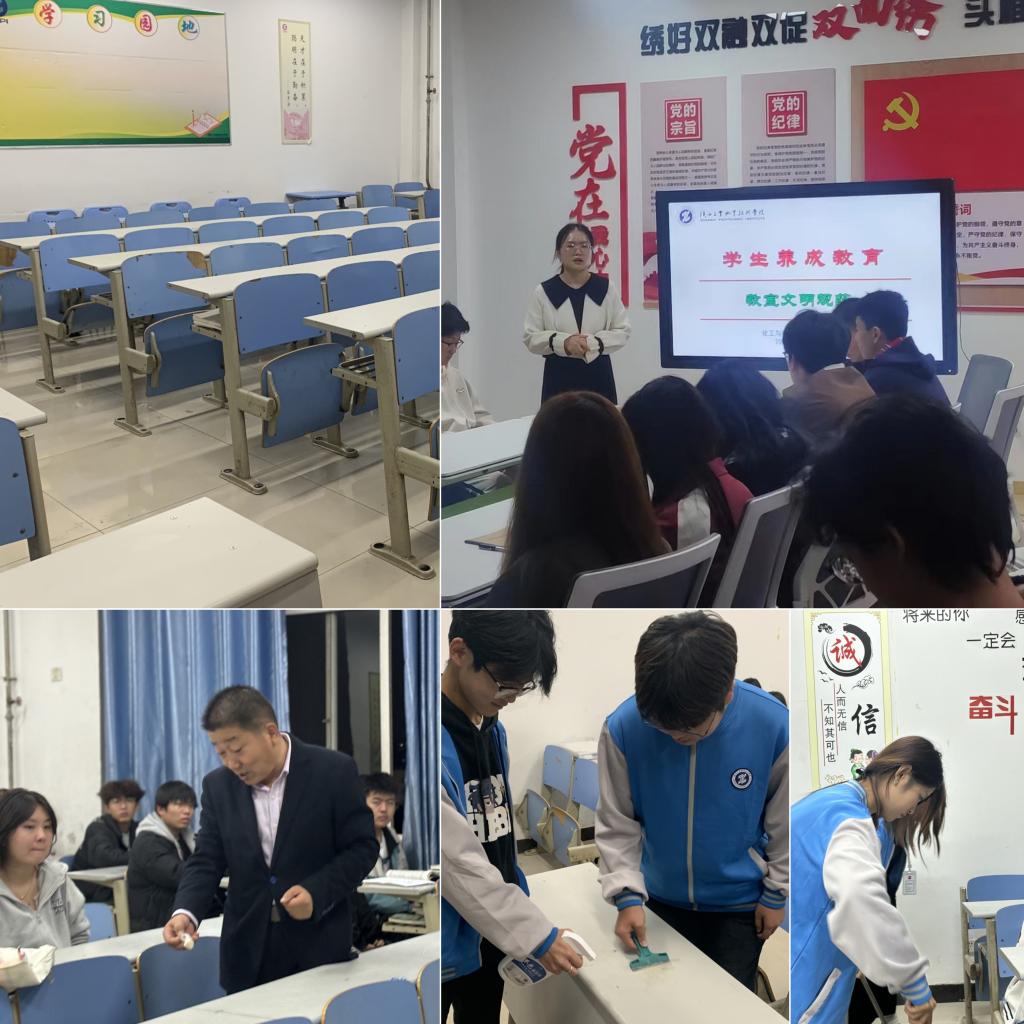文明主题班会养成良好习惯。为了共创文明卫生教室,11月3日晚上,化工与纺织服装学院大一、大二各班在晚自习教室开展“爱护教学环境 营造温馨育人环境”主题班会。此次班会以PPT、视频播放和分组讨论的形式介绍了教室卫生检查评分标准,各班根据《教室净化与美化评分标准》,明确工作任务,细化责任分工,制定各班教室值日安排表及劳动任务清单。同时,学院集中采购了除胶剂,铲刀,钢丝球等物品,由年级辅导员老师亲自带队,组织团学干部和各班班委对涉及的教室全面清理,按照区域划分,责任到班到人,逐间教室、逐张桌椅销号作战。通过师生不懈努力,教室面貌得到很大改观。针对劳动工具摆放不整齐,放置处地面污渍较多,纸篓较脏、多媒体设备、窗台、轨道表面灰尘较多,暖气片下存在卫生死角等问题全面彻查,全面清理。