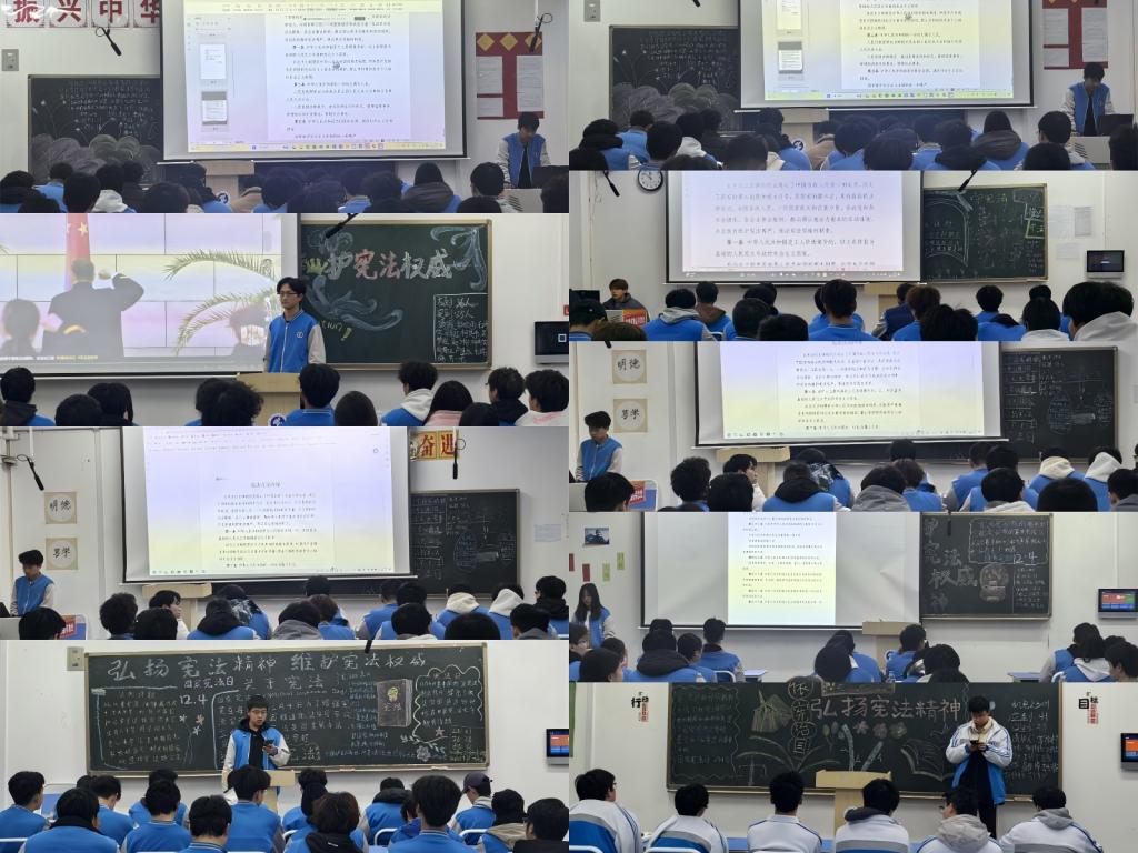 班会伊始,各班班长向同学们介绍了宪法的历史背景、基本内容和重要意义,强调宪法是国家的根本大法,是治国安邦的总章程,具有最高的法律地位、法律权威和法律效力。随后,通过播放宪法宣传视频,生动形象地展示了宪法在保障公民权利、规范国家权力运行等方面发挥的关键作用,鼓励同学们要树立正确的法治观念,学会用法律武器保护自己和他人的合法权益。同学们表示,通过此次主题班会,对宪法有了更加全面、深入的认识,今后将自觉遵守宪法和法律,积极维护宪法权威,为建设社会主义法治国家贡献自己的力量。