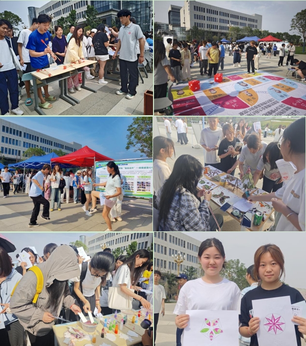 活动现场分为“签到打卡区”“一站一品展示区”“五育润心活动区”三大区域。在“签到打卡区”,同学们通过签名或画手印的方式完成签到,并领取“通关文牒”参与后续活动;“一站一品展示区”展示了各二级学院精心制作的心理主题展板以及现场互动小游戏,内容丰富,形式多样;“五育润心活动区”则围绕德、智、体、美、劳五大主题,设计了多项趣味心理游戏,让学生在游戏中感受五育融合的魅力。在“德润心田”活动区,同学们在“情绪飞行棋”中通过双脚跳跃释放压力,在“一穿到底”团队游戏中体验协作的快乐;“智启心灵”活动区的“超级汉诺塔”和“心灵迷宫”游戏挑战了同学们的逻辑思维与团队默契;“体健心晴”活动区在渭城和经开校区分别设置了“大脚板”“一箭倾心”投壶活动,让同学们在运动中收获团队协作的品质和快乐;“美育心窗”活动区的曼陀罗绘画和“自然疗愈九宫格”探索活动,引导同学们用艺术和自然疗愈心灵;最受欢迎的要数“劳筑心桥”活动区的非遗漆画书签DIY,同学们排起长队,迫不及待地想亲手制作属于自己的书签,大家小心翼翼地运用漂漆工艺,创作出独一无二的属于自己的艺术品。