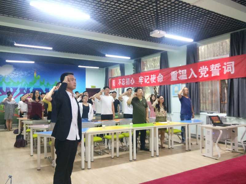 在国际歌结束后,2018届毕业生党员樊毅龙带领全体党员面对党旗重温了入党誓词。支部书记韩二豹要求全体毕业生党员,在步入社会后不要忘记自己的党员身份,在工作中能以身作则,发挥先锋模范作用,同时坚定理想信念,做好表率。最后,入党积极分子和发展对象以《我骄傲,我是中国人》为题进行了诗朗诵,表达了对祖国的热爱和对毕业生党员的祝福。