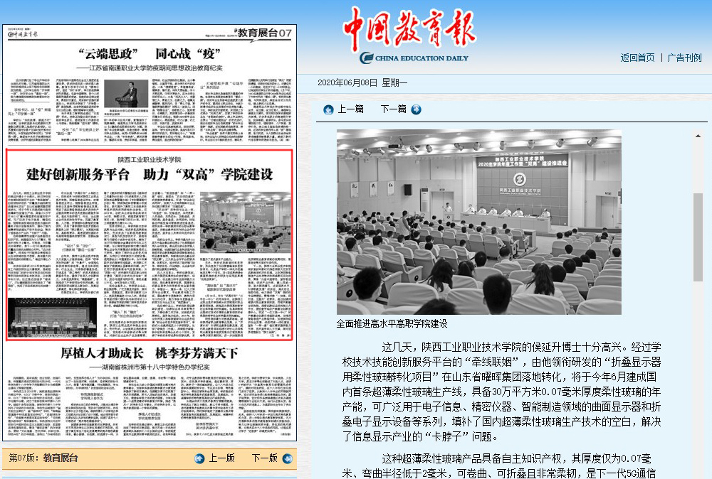 全面推进高水平高职学院建设这几天,星空web版登录入口的侯延升博士十分高兴。经过学校技术技能创新服务平台的“牵线联姻”,由他领衔研发的“折叠显示器用柔性玻璃转化项目”在山东省曜晖集团落地转化,将于今年6月建成国内首条超薄柔性玻璃生产线,具备30万平方米0.07毫米厚度柔性玻璃的年产能,可广泛用于电子信息、精密仪器、智能制造领域的曲面显示器和折叠电子显示设备等系列,填补了国内超薄柔性玻璃生产技术的空白,解决了信息显示产业的“卡脖子”问题。