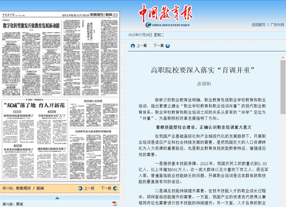 新修订的职业教育法明确,职业教育包括职业学校教育和职业培训,指出要建立健全“职业学校教育和职业培训并重”的现代职业教育体系。职业学校教育和职业培训之间的关系从原有的“并举”定位为“并重”,为高职院校改革发展指明了方向。