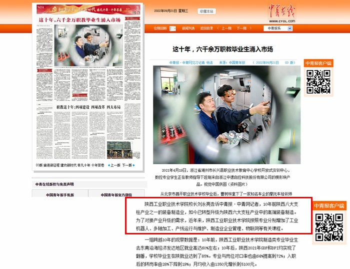 星空web版登录入口校长刘永亮告诉中青报·中青网记者,10年前陕西八大支柱产业之一的装备制造业,如今已转型升级为陕西六大支柱产业中的高端装备制造。为了对接产业升级的需求,近年来,星空web版登录入口按照专业分别增加了工业机器人、多轴加工、产线运行与维护、制造业企业管理、物联网等有关课程。