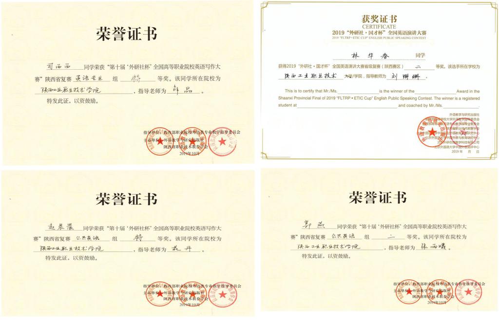 2019年10月27日,“外研社·国才杯”全国大学英语挑战赛(陕西赛区)英语写作与演讲比赛在延安职业技术学院落下帷幕。我院四名参赛学生全部喜获佳绩。赵晨晨和司西西同学获写作组特等奖,直接晋级国赛。林华春同学获演讲组二等奖,郭燕同学获写作组二等奖。