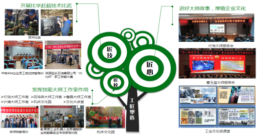 联合企业建成曹晶大师、付浩大师、田浩荣大师、计清大师等4个技能大师工作室。通过讲好大师故事、大师-教师“双师结对”、大师指导学生实践课程、大师指导学生技能大赛、大师指导学生科技创新、协同行业企业开展技术比武、红色匠心进课堂等措施,在全院树立技能强国的思想,营造良好“匠校”氛围,使学生在耳濡目染的环境中坚定“匠心”,在大师的言传身教中锤炼“匠技”,促进学生综合职业素质全面提升。