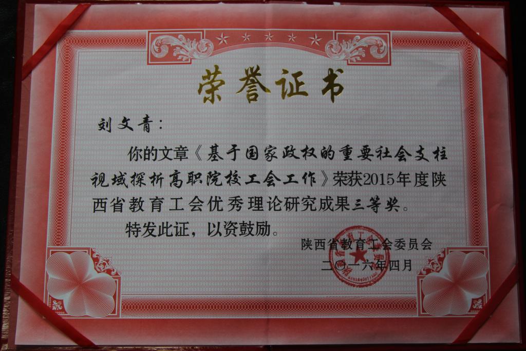 2015年初,我院工会加大工运理论研究的支持力度。一方面,积极发挥陕西工院工运理论研究会的作用,大力号召学院工会委员、分会主席和委员、乃至普通工会会员积极投身工运理论研究工作;另一方面,组织工会委员构成的评审团从选题、调研和论文撰写、结构设计、格式等方面全面支持、全程指导。最终,在全院范围内选送6篇工运理论研究成果上报省教育工会参评,2篇获奖。工会主席刘文青撰写的工会调查报告连续五年荣获省教育工会优秀理论调研成果奖,此次撰写的《基于国家政权的重要社会支柱视域探析高职院校工会工作》一文不但被评为优秀理论研究成果三等奖,还被西北大学公开出版的期刊《高教发展研究》2016年第2期收录发表,为全省高职院校工会工作提供了经验和借鉴。工会王金省老师撰写的《“认家”活动意义琐议》获得优秀理论研究成果三等奖。