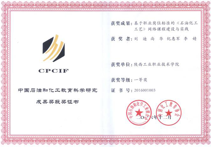 12月26日,全国石油和化工职业教育教学指导委员会2016年工作会议在北京召开,会议公布了第四届中国石油和化工教育科学研究成果奖评选结果。我院刘迪、尚华、纪惠军、李婧申报的《基于职业岗位标准的<石油化工工艺>网络课程建设与实践》荣获一等奖;孙琪娟、杨建民、王化冰、罗晋朝、张小军申报的《“四级递进”化工总控岗位职业能力培养模式创新与实践》荣获三等奖。全国职业教育教学指导委员会办公室主任王国川、石化行指委主任任耀生为其颁奖。