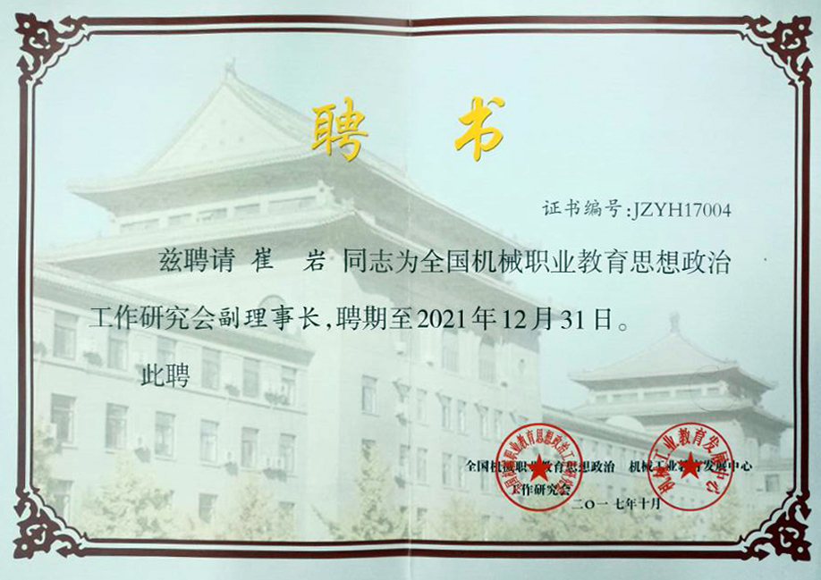 本次换届大会由机械工业教育发展中心、全国机械职业教育思想政治工作研究会和全国机械职业教育教学指导委员会共同举办,会议进一步明确了党的十九大召开以后行业职业教育思政工作发展的新方向,必将极大促进机械行业职业教育文化育人工作的发展。会上,我院党委书记崔岩同志当选全国机械职业教育思想政治工作研究会副理事长。
