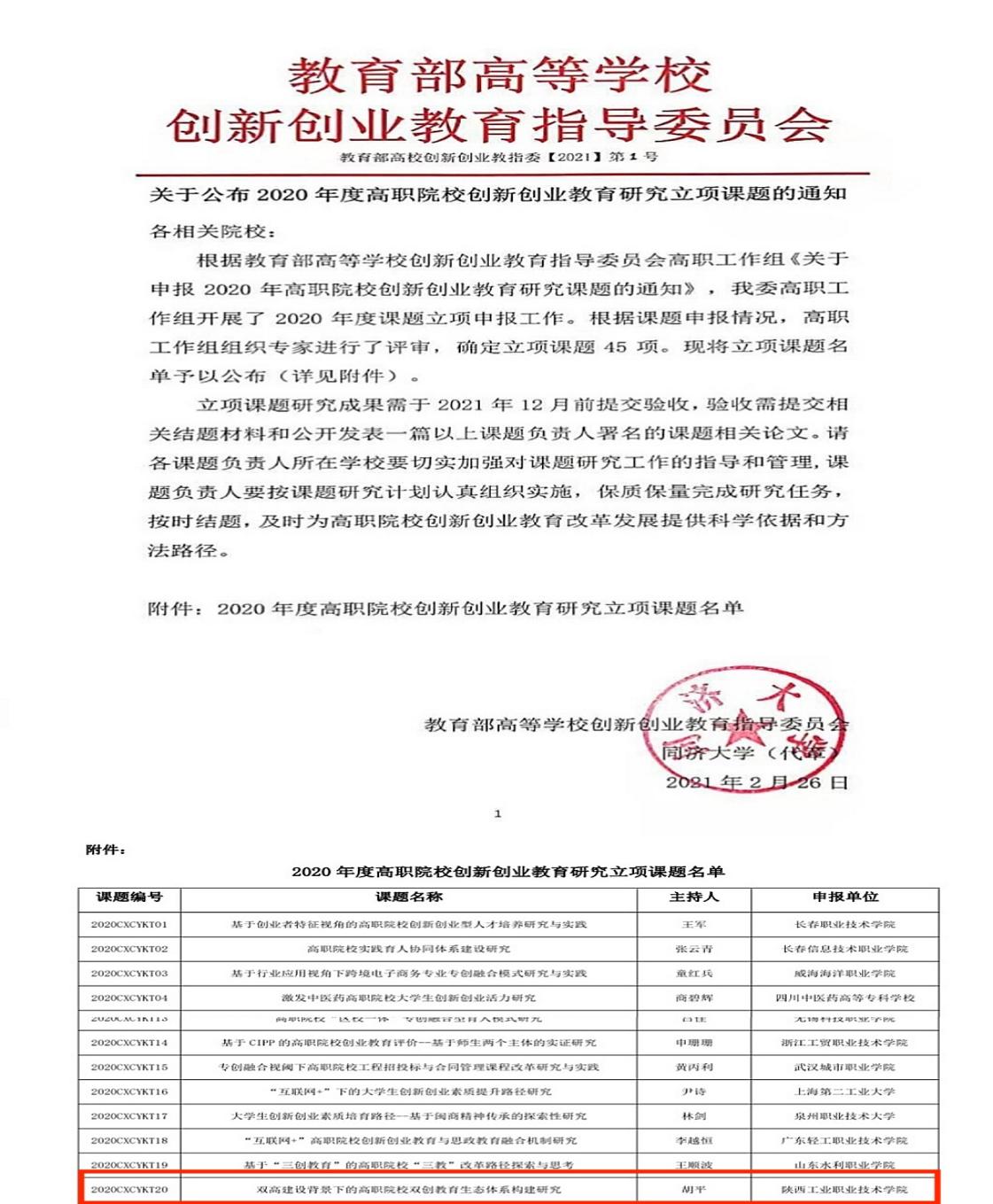 4月26日,教育部高等学校创新创业教育指导委员会发布“2020年度高职院校创新创业教育研究”课题立项名单,我校西部创新创业研究院院长胡平教授主持申报的课题《双高建设背景下的高职院校双创教育生态体系构建研究》获批立项。该课题旨在有针对性地、系统地、多层次多角度地构建创新创业教育的实施体系,探索出具有实效的高职院校学生创新创业教育新的生态体系。
