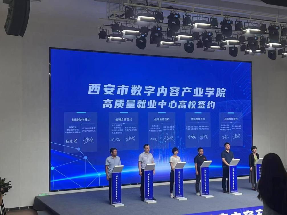 西安市未来数字内容产业研究院与陕西西咸文旅集团等四家企业签署理事单位协议,与中国移动西安分公司等两家企业签署战略合作协议,研究院高质量就业中心与西安理工大学等十五所高校院所签署合作协议。