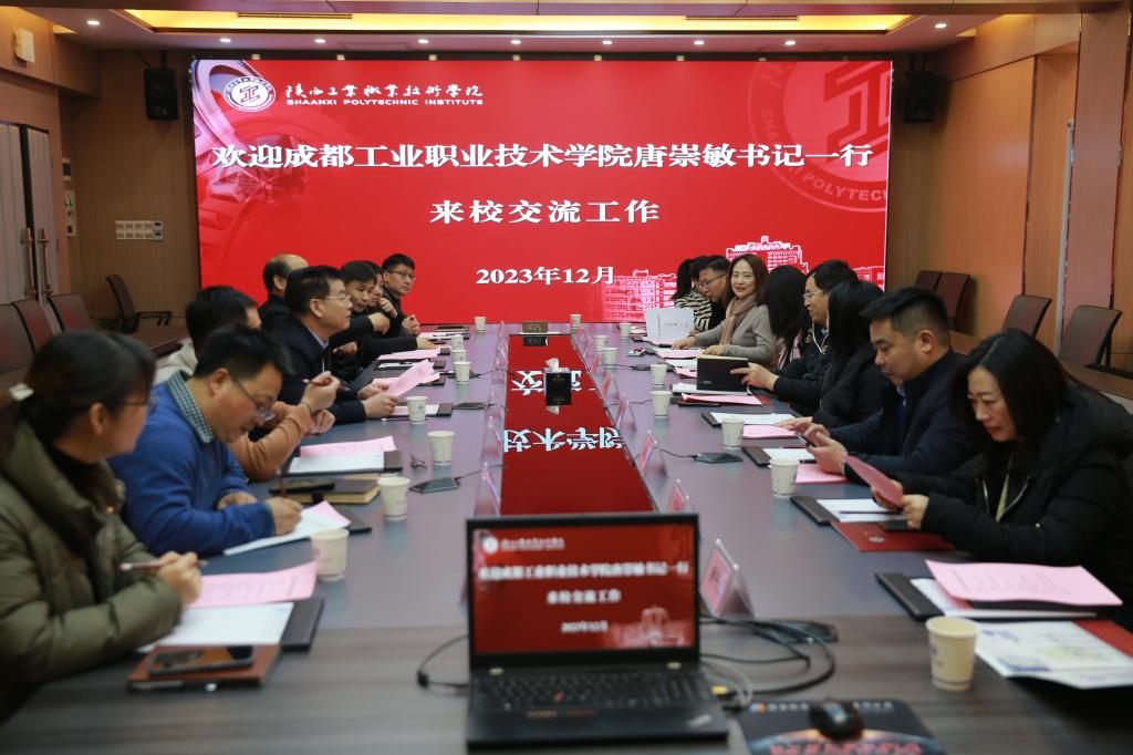 座谈会上,刘校长首先对唐崇敏一行的来访表示热烈欢迎。双方共同观看了学校宣传片《红色匠心》,刘校长围绕我校近几年“双高”建设、新校区建设、申办职教本科三件大事,简要介绍了学校历史沿革、发展概况、校区建设等方面工作情况,并分享了学校内部治理等方面的经验。唐崇敏对我校近年来取得的成绩给予高度评价,并简要介绍了成都工业职业技术学院基本情况及办学现状,并希望与我校进一步加强沟通交流,形成共同发展良好局面。随后,双方相关部门围绕“双高”建设、内部治理等工作进行了深入交流。