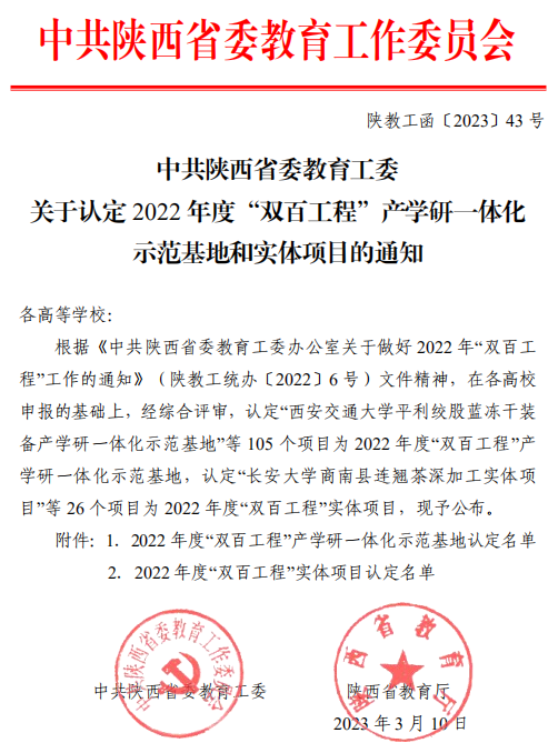 近日,中共陕西省委教育工作委员会下发了《关于认定2022年度“双百工程”产学研一体化示范基地和实体项目的通知》(陕教工函〔2023〕43号),分别认定了105个基地以及26个项目为2022年度陕西省“双百工程”产学研一体化示范基地和实体项目,我校结对帮扶礼泉县共建的“星空web版登录入口产学研一体化示范基地”被认定为2022年度陕西省“双百工程”产学研一体化示范基地。