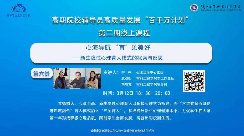 3月12日,高职院校辅导员高质量发展“百千万计划”第二期第6讲正式开课,本次课程分别由心理咨询中心主任柳林、材料工程学院学工办主任赵盼盼,材料工程学院辅导员胡瑞霞主讲,交流分享以《心海导航,“育”见美好——新生隐性心理育人模式的探索与反思》为题,分别从学校、二级学院、辅导员等层面进行经验交流。学校层面通过积极自我、积极情绪、积极关系、积极意义、积极投入、积极成就“六个内容维度”,新生入校后的印象、体验、感悟阶段到自我发现、自我发展“五个成长阶段”以及校园文化场、学科教育场、朋辈互助场、家校合作场“四个生活场域”实践探索“六维共育五阶递进四域融合”新生隐性心育模式。二级学院层面以新生群体心理健康情况“画像”为基础,开展“筑心计划”,实现“以心育新”。通过全员构建心理健康教育“好氛围”;全方位搭建心理连接“立交桥”;全过程培育新生适应“知情意”等方法全面提升心理健康水平。辅导员层面分别从看出病因子,摸清新生常见的隐性心理问题;找对药引子,针对新生开出疏导“良方”;去除病根子,开启新生未来“心”征程等三个层面开展具体育人实践,通过对新生隐藏的心理问题进行“望闻问切”,对症下药,培养学生积极心理品质、激发学生的正能量。