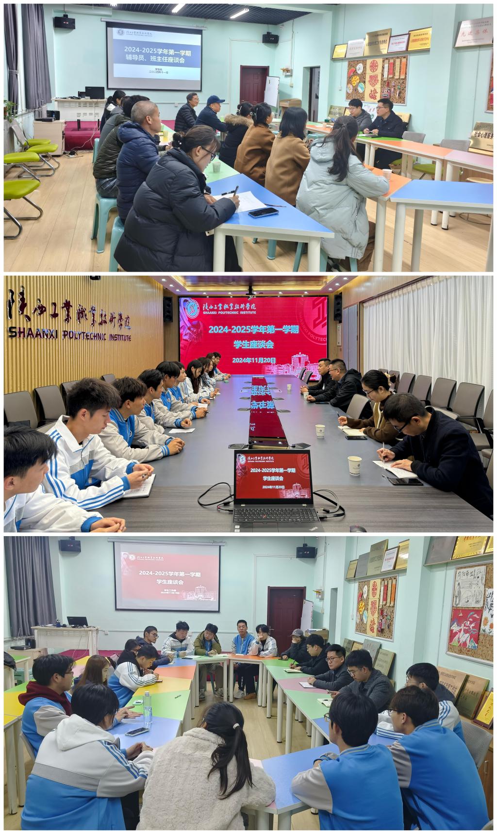 根据《关于开展2024-2025学年第一学期学生教育管理期中检查工作的安排》,学生处于11月22日召开了辅导员、班主任座谈会,11月19日和20日,分别在渭城校区、经开校区召开了学生座谈会,二级学院辅导员、班主任代表、学生代表,以及学生处科级以上干部70余人分三场进行了座谈。