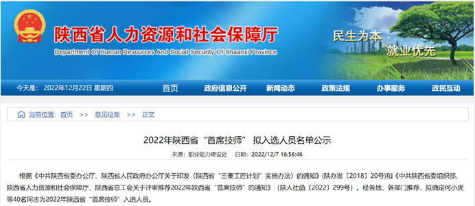 近日,陕西省人社厅公布《2022年陕西省“首席技师”入选人员名单》,经各地、各部门推荐,共确定40名同志入选2022年陕西省“首席技师”。我校刘艳申同志成功入选,陕西省高职院校唯一。