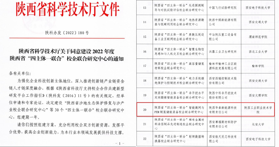 近日,陕西省科学技术厅发布了《陕西省科学技术厅关于同意建设2022年度陕西省“四主体一联合”校企联合研究中心的通知》(陕科办发[2022]180号),由我校与陕西华秦新能源科技有限责任公司联合共建的“智能微网与PEM制氢储能装备校企联合研究中心”获批建设陕西省“四主体一联合”校企联合研究中心,全省共获批30个研究中心,我校也是唯一获此平台的高职院校。