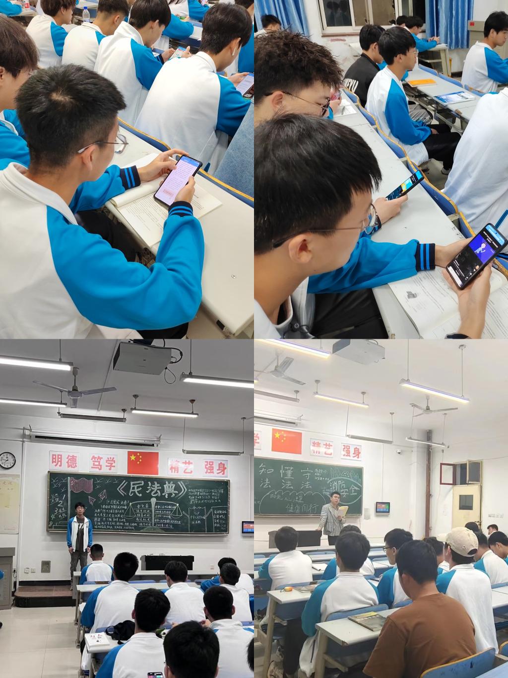 此次班会通过班级微信群向全体学生推送民法典和《条例》学习材料,营造浓厚的学习氛围;同时组织学生参加全国普法办在中国普法微信公众号开展的民法典知识竞答,引导学生进一步增强自觉守法、遇事找法、解决问题靠法意识,迅速掀起普法宣传热潮;同时各班班主任向同学们讲解了校园民事纠纷案例,帮助学生答疑解难,引导学生争做知法、守法的时代新人。