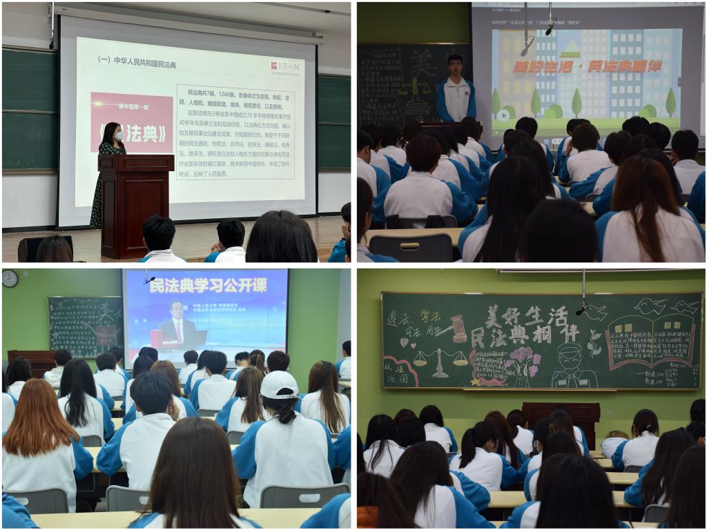班会上,各班班主任组织同学们观看了《民法典》相关普法视频,使同学们全面了解《民法典》的诞生历程、重要意义和主要内容。随后,班主任结合校园实际,向同学们普及了《民法典》相关法律知识,重点讲解了杜绝校园霸凌、谨防电信诈骗等关系学生切身利益的法条和案例。案例分析生动、通俗易懂、引人入胜。