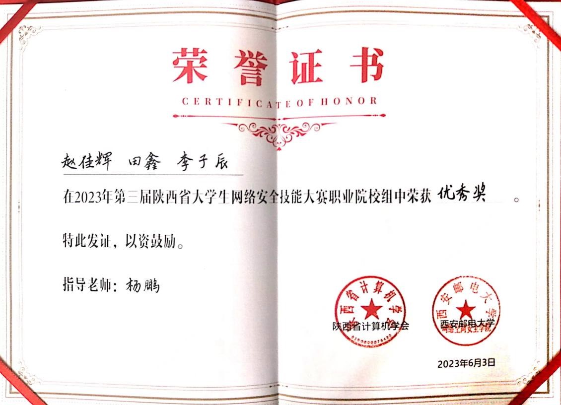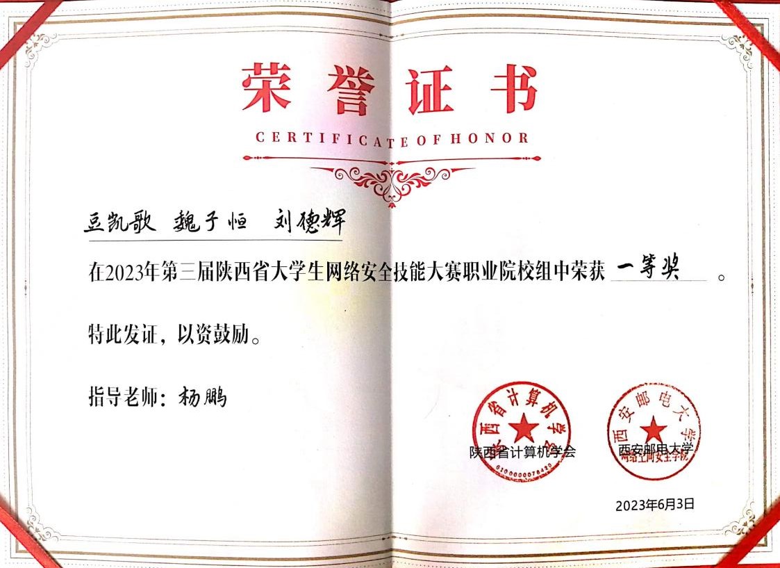 6月3日,由陕西省计算机学会主办,西安邮电大学网络空间安全学院、西安四叶草信息技术有限公司承办的2023年第三届陕西省大学生网络安全技能大赛-职业院校组在线上举行,来自全国150个高校队伍一较高下,由我校信息工程学院杨鹏老师指导的6名同学(两个战队),荣获一等奖和优秀奖各一项。