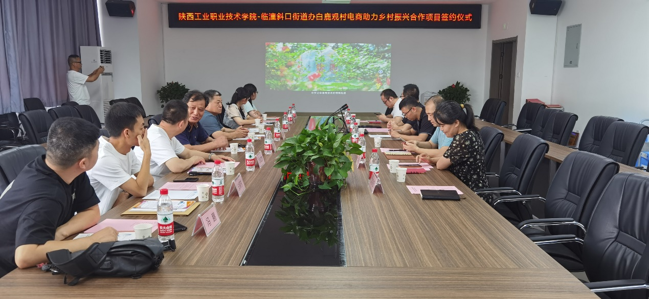 商贸与流通学院党总支副书记侯涛、副院长张光、电商教研室主任和专业带头人,临潼斜口街道办白鹿观村村委书记房福奎一行5人,以及西安今成电子商务有限公司总经理刘吉龙一行3人参加本次签约仪式,会议由陕西工院商贸与流通学院实训中心主任杨涛主持。