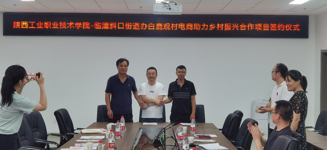 最后,陕工院商贸与流通学院、临潼区斜口街道办白鹿观村、西安今成电子商务有限公司三方代表张光副院长、房福奎书记、刘吉龙总经理签署了三方协议,宣告了“校、企、政”三方合作正式启动。