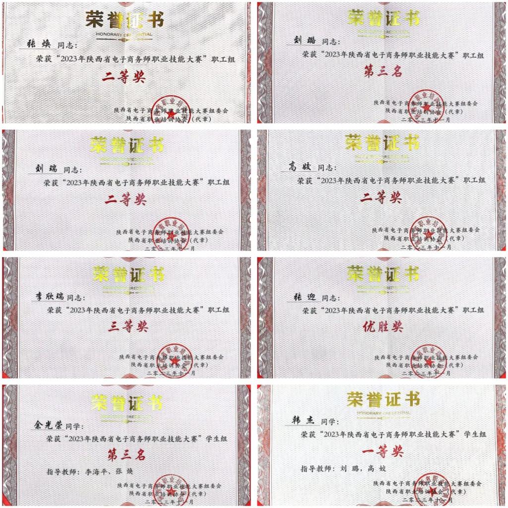本次决赛共有84名选手参赛,分为职工组和学生组,大赛考核包含网络推广、视觉营销设计、网上交易管理、网络客户服务、电子商务数据分析与应用、网店直播等六个模块,全面考察参赛师生电子商务领域的专业技能和职业素养。经过激烈角逐,职工组刘璐获得前三名,张焕、刘瑞、高姣均获二等奖,李欣瑞获三等奖,张迎获优秀奖,同时,刘璐、张焕、高姣3名教师获电子商务师(高级)职业技能等级资格,刘璐老师被授予“陕西省技术能手”称号;学生组电商2303班余光荣获第三名、电商5202班韩杰获一等奖。