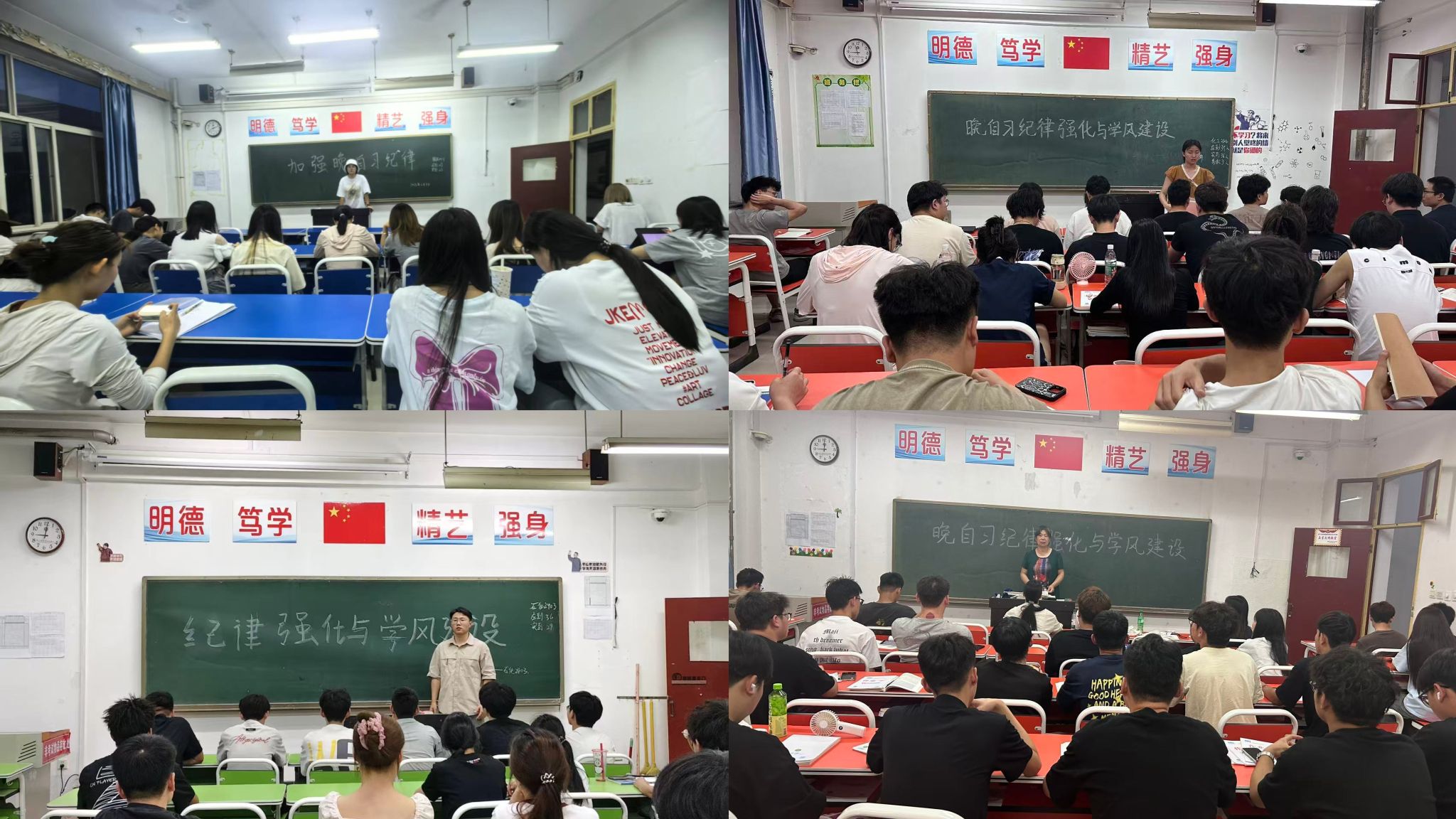班会上,班主任开门见山,强调晚自习纪律是学风建设的关键一环,关乎每位同学的学习成效与个人成长。近期,学院发现部分同学晚自习时纪律意识淡薄,存在交头接耳、玩闹嬉戏等松散现象,这不仅干扰了自身学习进度,更破坏了班级整体的学习环境。接着,班主任结合学院规章制度,明确指出晚自习期间严禁扎堆玩纸牌、大声喧哗、打游戏等行为,要求同学们严守纪律,争分夺秒投入学习。同时,鼓励大家制定科学合理的复习计划,提升学习效率,遇到难题及时向老师和同学求助。同学们积极表态,承诺会自觉遵守晚自习纪律,以昂扬的热情和严谨的态度投入学习。
