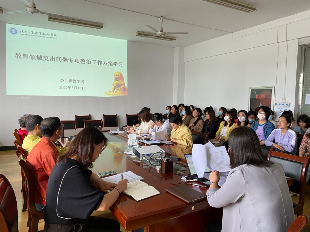 5月18日下午,公共课教学部在A711会议室组织召开教育领域突出问题专项整治工作学习会。会上,赵娇副部长领学了学校《教育领域突出问题专项整治工作方案》。
