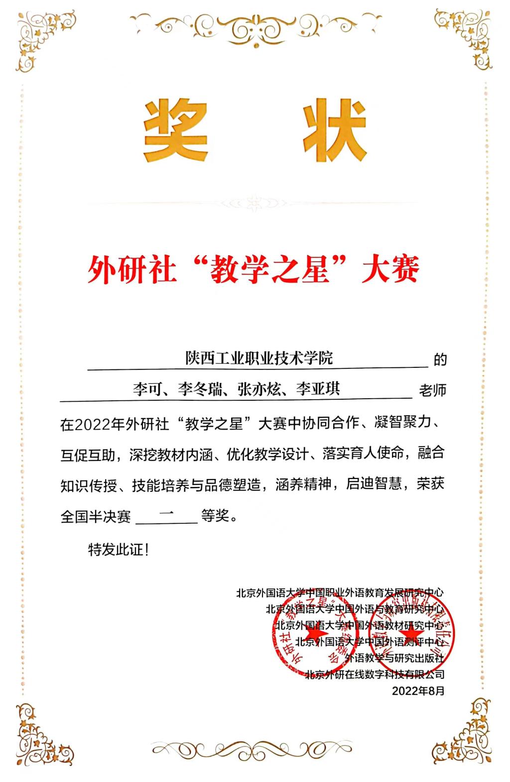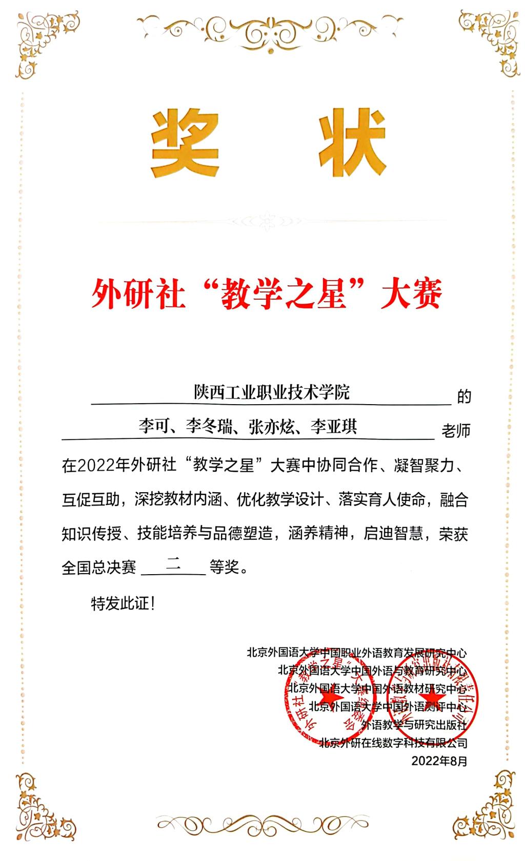 近日,由教育部高等学校大学外语教学指导委员会和外语教学与研究出版社共同主办的2022年外研社“教学之星”大赛(高职组)全国决赛落下帷幕。本次大赛以面向全国云端直播的形式举行,职业院校英语教师近3万人次云端观看。我校公共课教学部李可、李冬瑞、张亦炫、李亚琪老师组成的教师团队在与全国众多高校优秀参赛教师队伍的激烈角逐中,最终荣获全国半决赛一等奖暨全国总决赛二等奖。