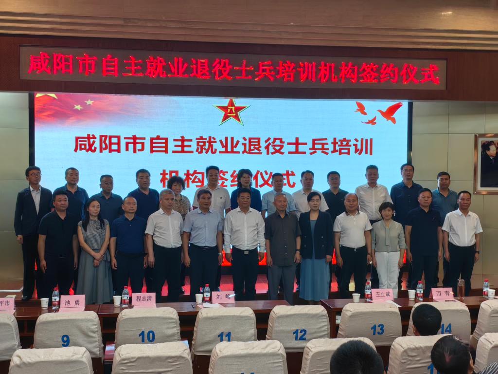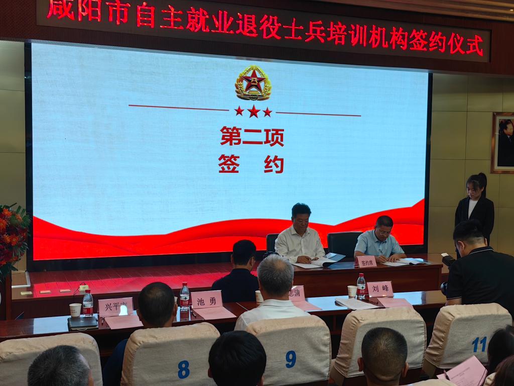 签约仪式由咸阳市退役军人事务局副局长程清志主持。陕西国际商贸学院院长王正斌致欢迎词并代表六家培训机构承诺。2023年退役士兵薛康康表态发言。咸阳市退役军人事务局局长刘峰与我院继教培训学院院长闫军成功签约。