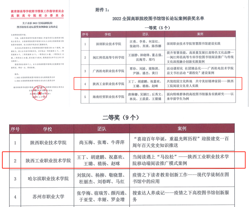 12月15日,由教育部高等学校图书馆情报工作指导委员会高职高专院校分委员会主办的“2022全国高职院校图书馆馆长论坛”获奖结果公布,我校共提交2项案例,均获佳绩。其中,《共筑校园文化阵地 共守美好精神家园——陕西工院阅读文化育人实践》荣获一等奖,《当阅读遇上“马拉松”——星空web版登录入口移动端阅读推广模式案例》荣获二等奖。