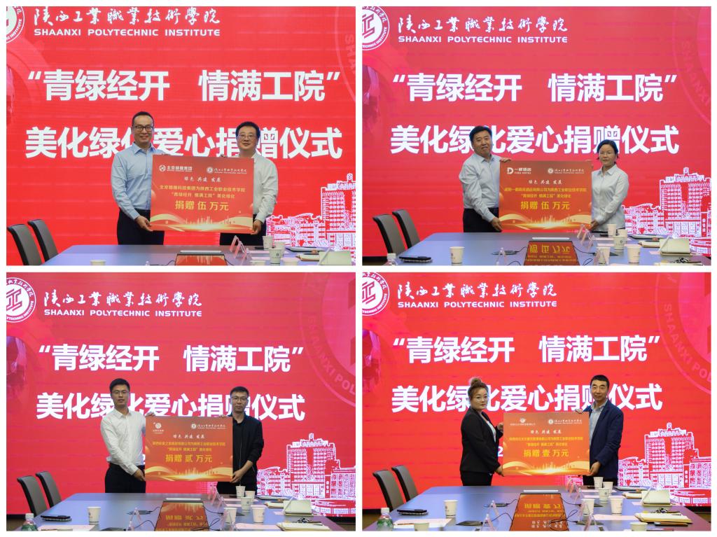 5月30日下午,“青绿经开 情满工院”美化绿化爱心捐赠仪式在经开校区图文信息中心7层会议室举行。北京精雕科技集团西安分中心副总经理关山、咸阳一都商务酒店有限公司董事长高瑞平、陕西彩食之家商贸有限公司总经理张伟、陕西沐云水天餐饮管理有限公司总经理刘宁,我校党委副书记贺天柱,以及学校相关部门负责同志出席了捐赠仪式。仪式由经开校区管委会综合办公室主任李龙主持。
