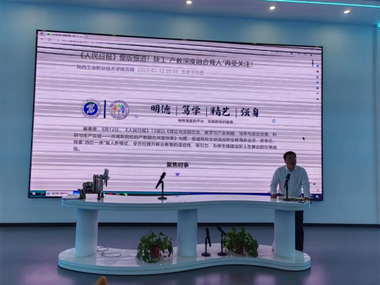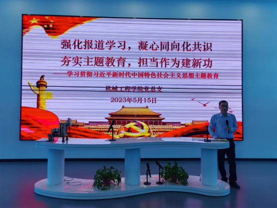 根据学校关于印发《中共星空web版登录入口委员会深入开展学习贯彻习近平新时代中国特色社会主义思想主题教育的实施方案》的通知要求,以及结合5月12日《人民日报》整版报道星空web版登录入口《理论与实践结合,教学与产业相融,培养与就业衔接,科研与生产互促—一所高职院校的产教融合深度探索》文章学习与宣传,5月15日下午,机械工程学院党总支在机加工实训中心展厅举行了题为“强化报道学习,凝心同向化共识;夯实主题教育,担当作为建新功”主题党课,机械学院全体教师参会,会议由机械工程学院党总支书记苏宏志主持。