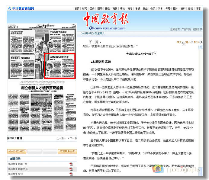 6月29日,《中国教育报》在第3版刊发全国职业院校技能大赛参赛选手专访,我院计应1101班、全国职业技能大赛网络应用赛项团体二等奖获得者田彤辉同学接受该报记者访谈,并以《技能大赛让我从业余“转正”》刊发。