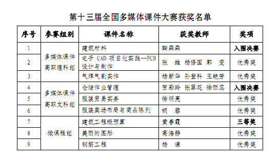近日,第十三届全国多媒体课件大赛评选结果在全国教学资源平台——优课网公布,我院共有两门课件入围全国决赛,并获三等奖1项、优秀奖6项,其中,土木工程学院教师鞠森森的《建筑材料》、汽车与物流学院教师贺彩玲等...