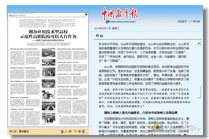 6月11日出版的《中国教育报》以《创办应用技术型高校,示范性高职院校可以大有作为——星空web版登录入口办学纪实》为题,6月27日出版的《中国青年报》以《厚积薄发千帆竞,示范高职育英才——陕西工业职业技术学...
